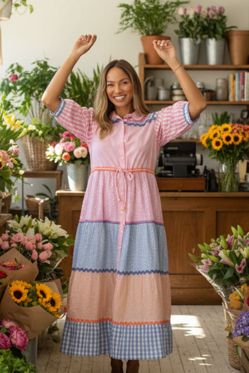 The Bonnie Midi is what happens when patchwork charm meets main-character energy. Soft shades of blush, peach and sky blue dance together in tiers of gingham and gentle contrast trims, giving you that “just wandered through a flower market in Europe” feeling — even if you’re just popping out for coffee.
