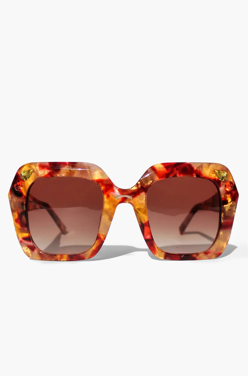 A radiant oversized frame adorned with topaz and citrine crystals. Layers of ruby, apricot, and champagne acetate shimmer like sunlight through glass.
