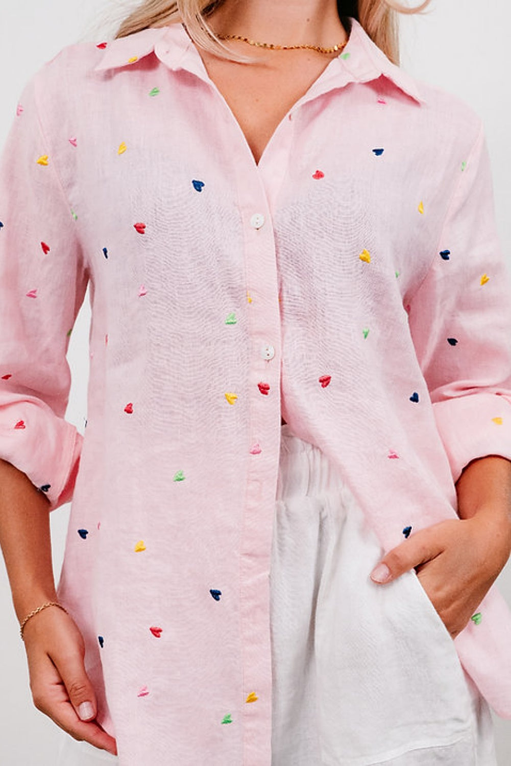 When you want your outfit to shout “love” without saying a word, this is the shirt you reach for. Crisp and breezy with a sprinkle of rainbow‑coloured hearts, it’s a classic button‑down gone adorably rogue. Knot it at the waist for a chic, laid‑back vibe or tuck it into high‑waisted jeans for an easy polished look.