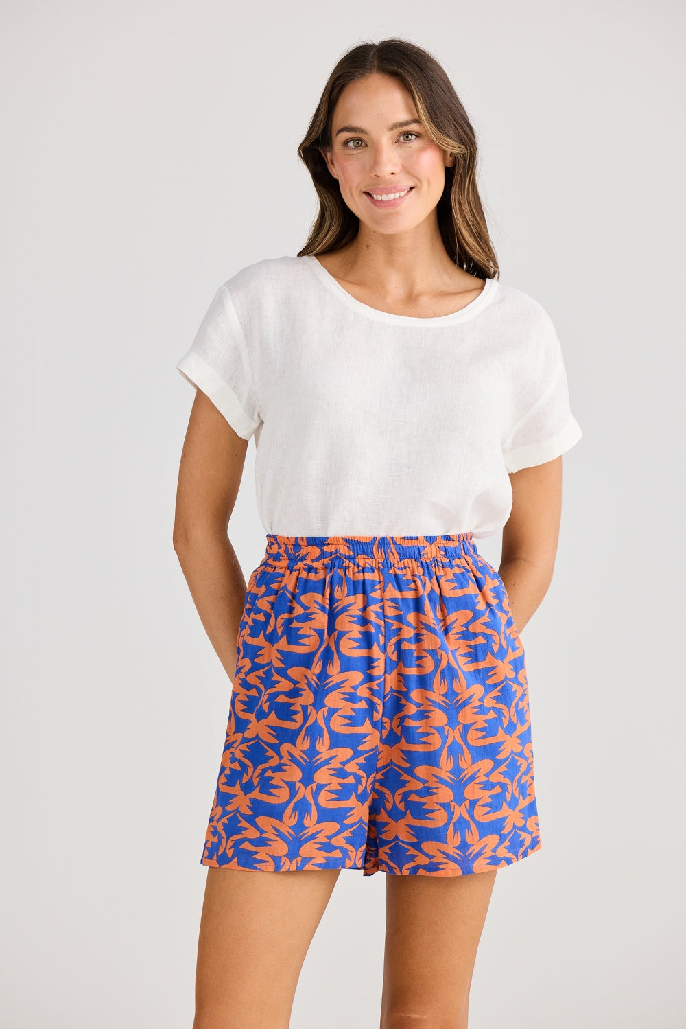 Add a splash of holiday mood to your everyday lineup. These Soleil Shorts bring vibrant cobalt and tangerine prints to an easy, breezy silhouette – perfect for slipping on with a crisp tee, a relaxed shirt or over your favourite swimsuit.
