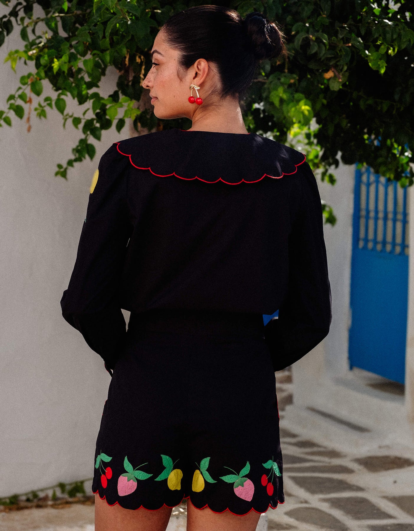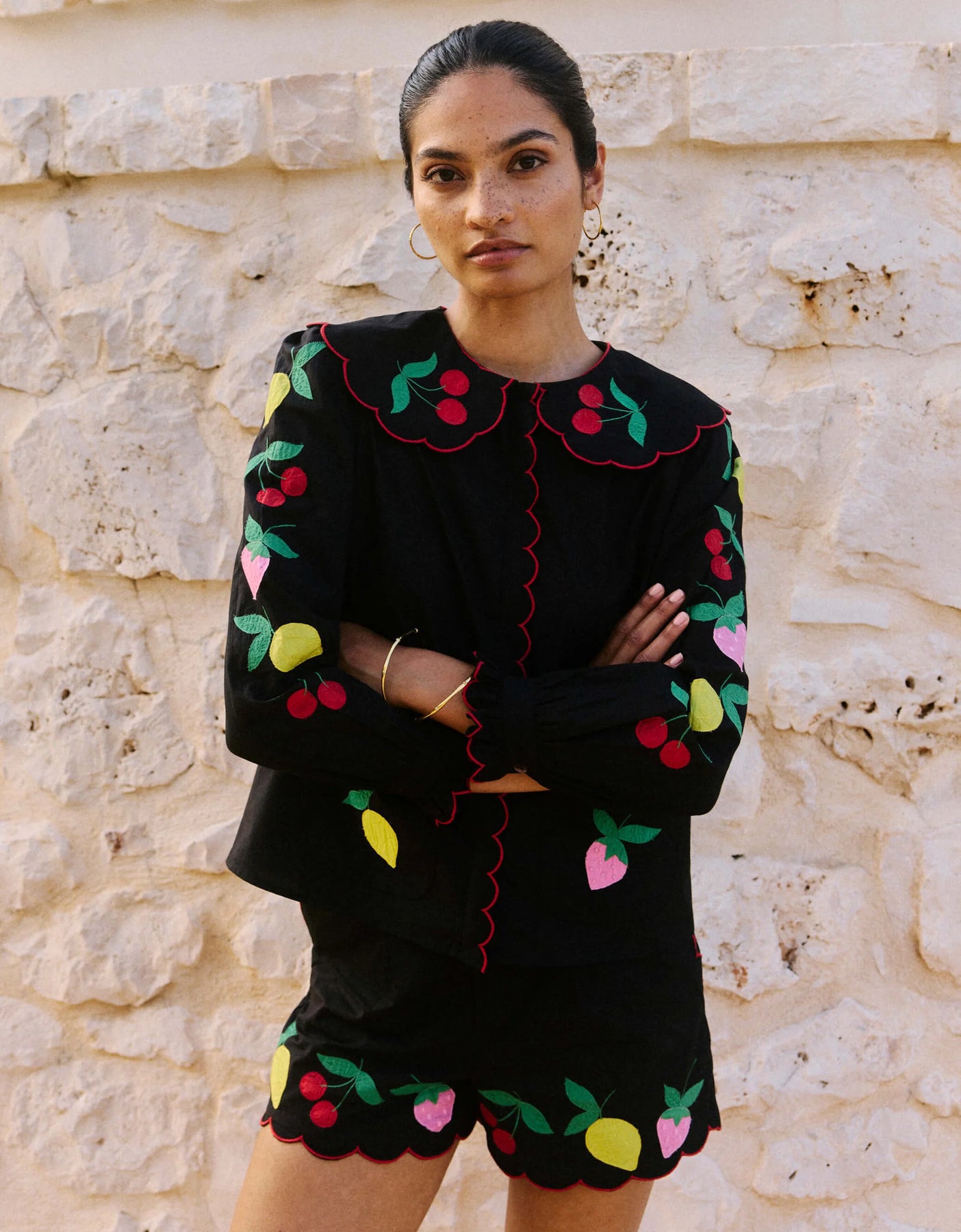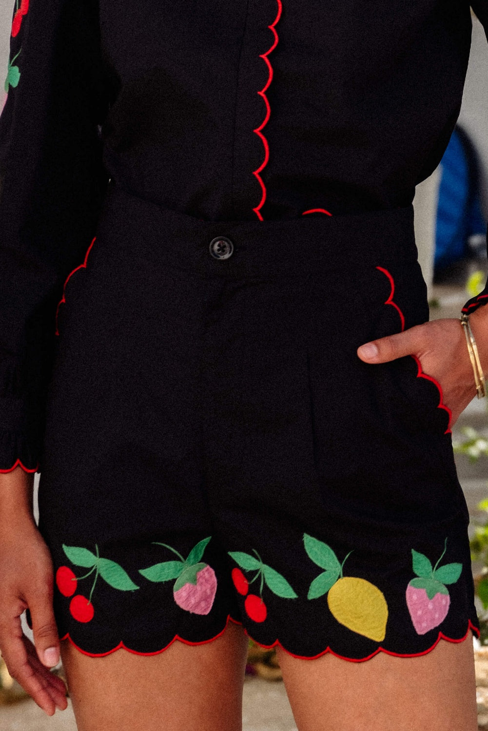Designed to add a little fun to your wardrobe, our Feeling Fruity Ava shorts are good enough to eat! Complete with joyful, fruit appliqué embroidery sweeping across the hem, the Ava shorts have a flattering, high waisted fit and intricate red scallops to finish. Pair with the matching Apple blouse for a statement look, or style with a colour-block jumper for an effortless combination.
