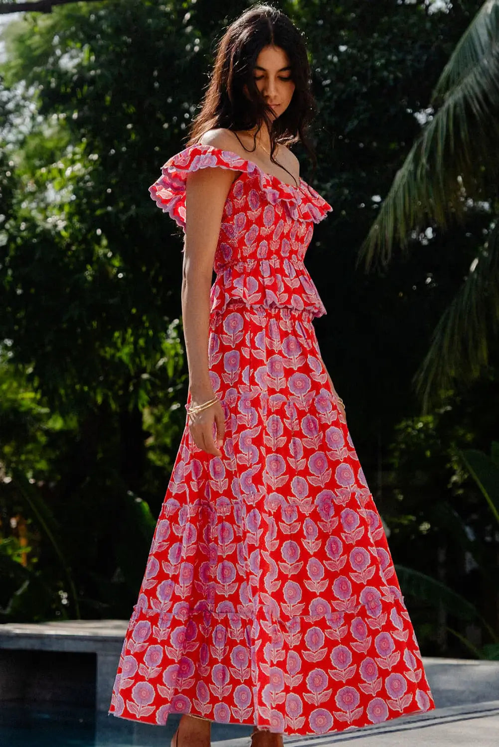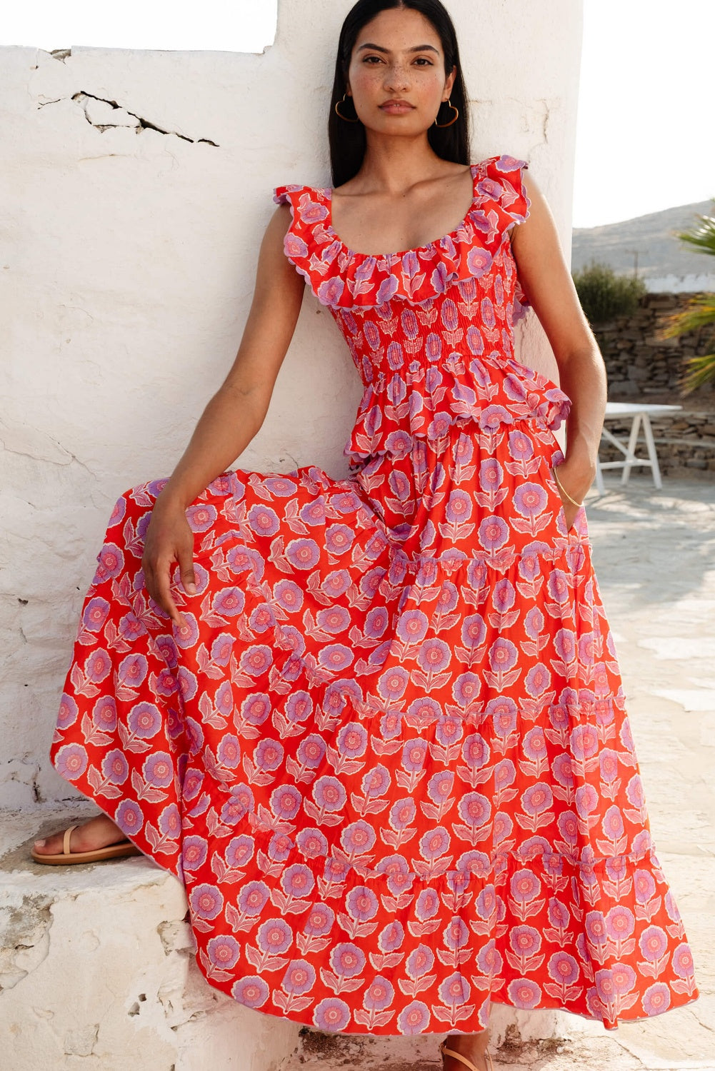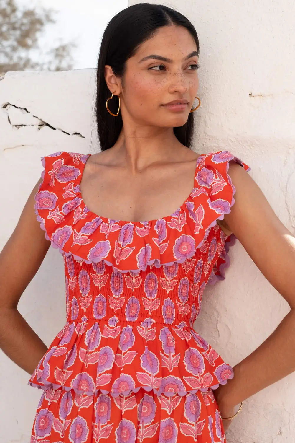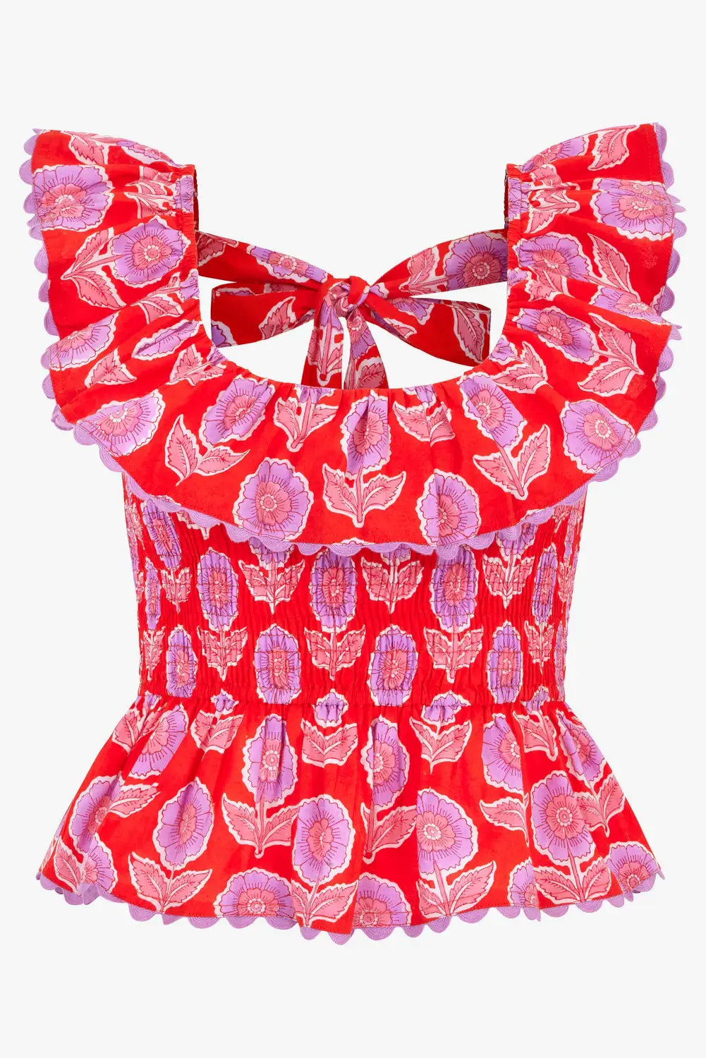Screen-printed by hand in pretty shades of lilac, pink and red, our Perfume Dahlia Susie top is a versatile piece you’ll be wearing again and again. Finished with a statement, ruffled scoop neckline and pretty bow back, the Susie top features rows of comfortable smocking and a flattering peplum silhouette. Pair with the matching Rah Rah skirt for special occasions, or style with linen shorts for a more casual trip. Finished with a playful, lilac ric-rac trim.