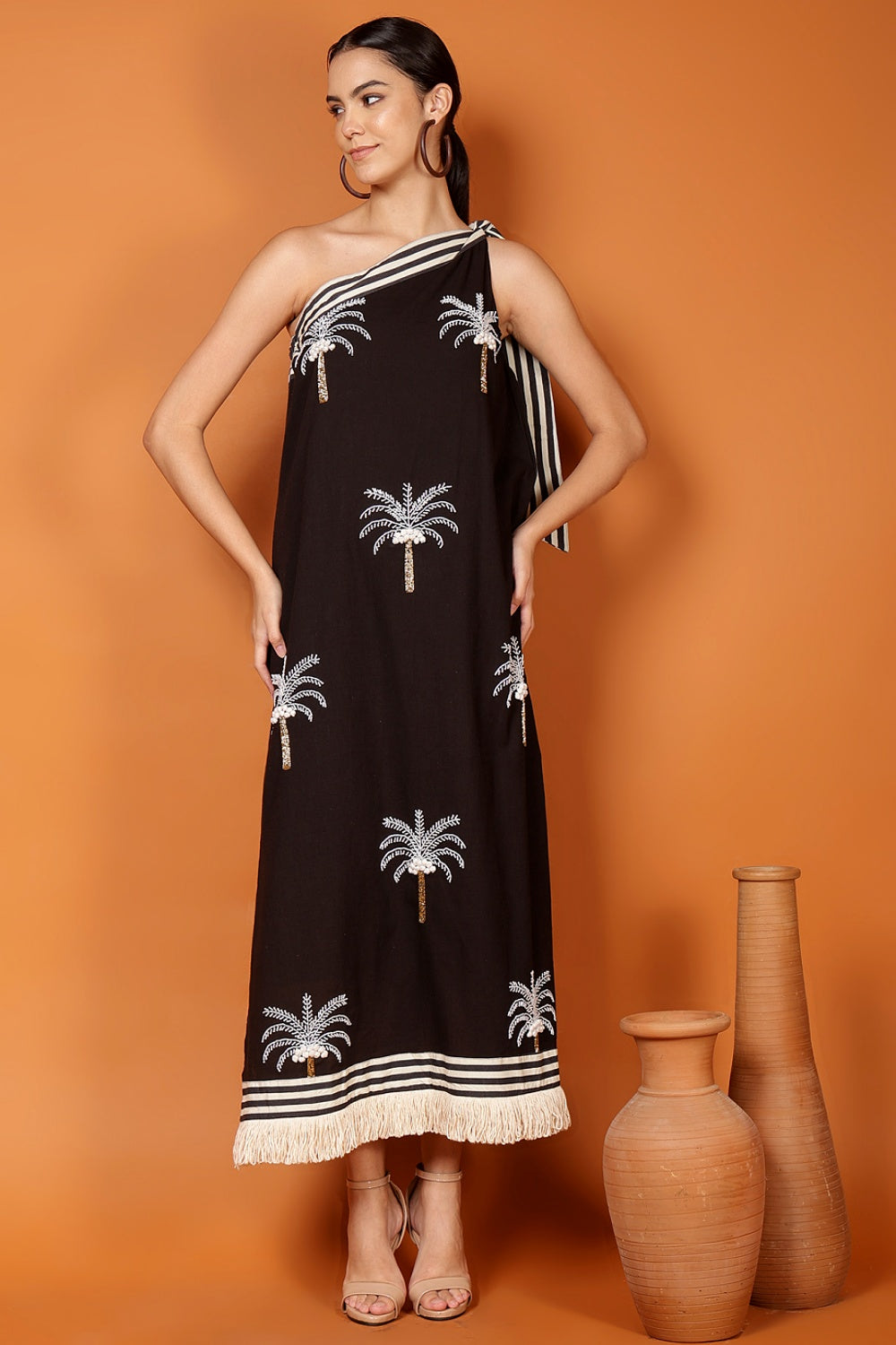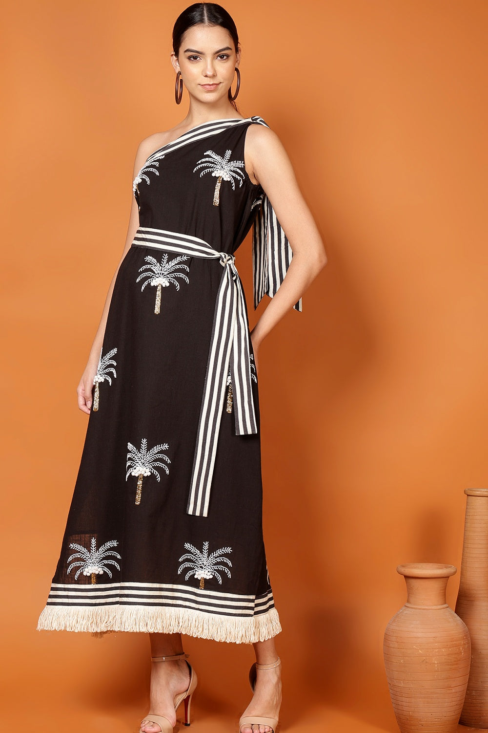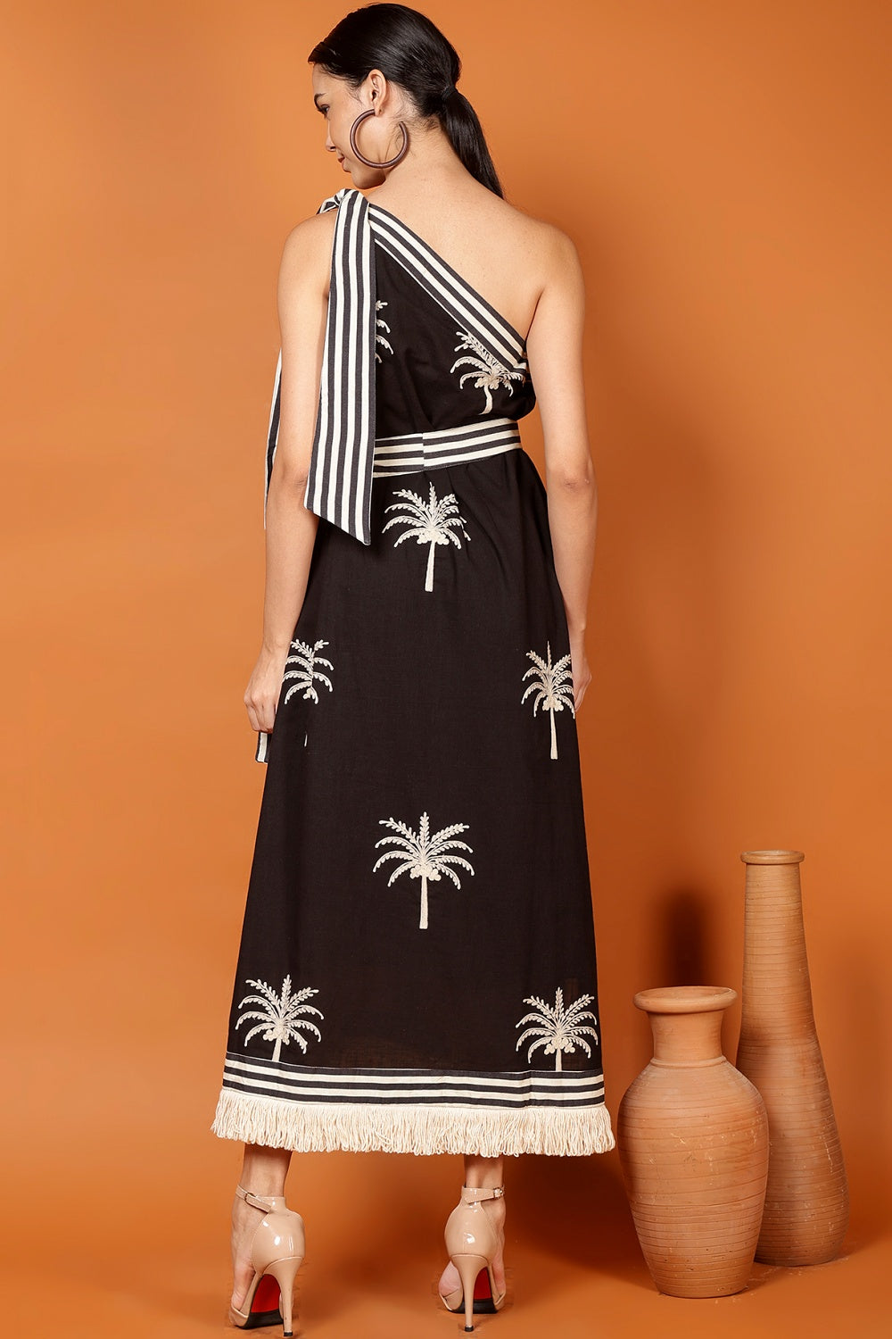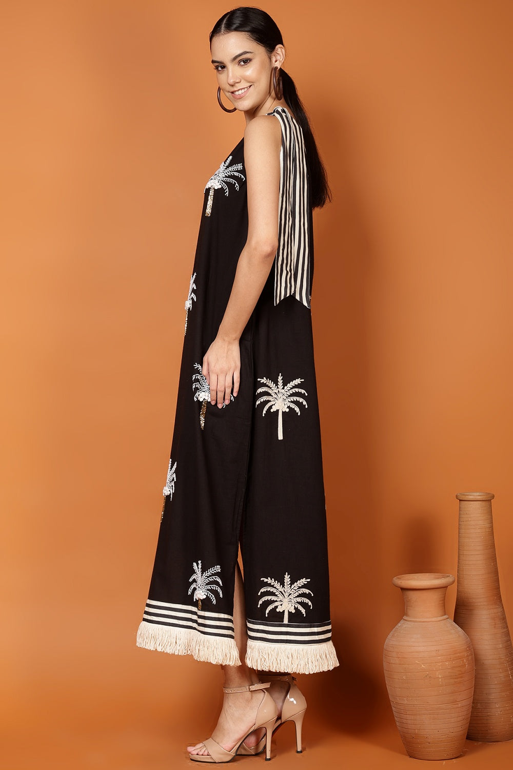 The striped shoulder tie and waist sash add just enough structure to flatter, while still allowing full freedom for strolling, lounging, or dramatically turning when someone calls your name. Finished with a playful fringe hem, it moves with you—and occasionally ahead of you—like it has plans.