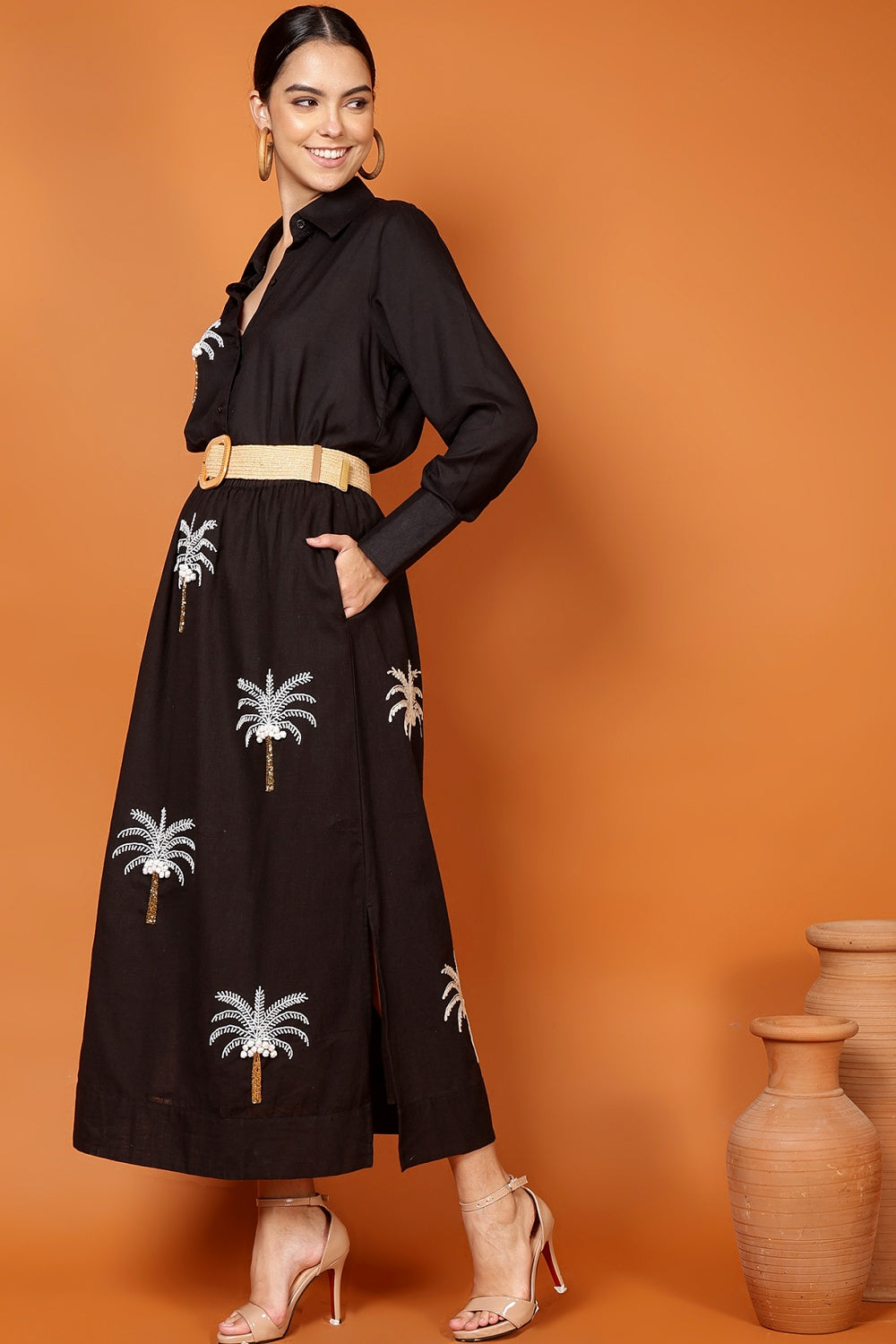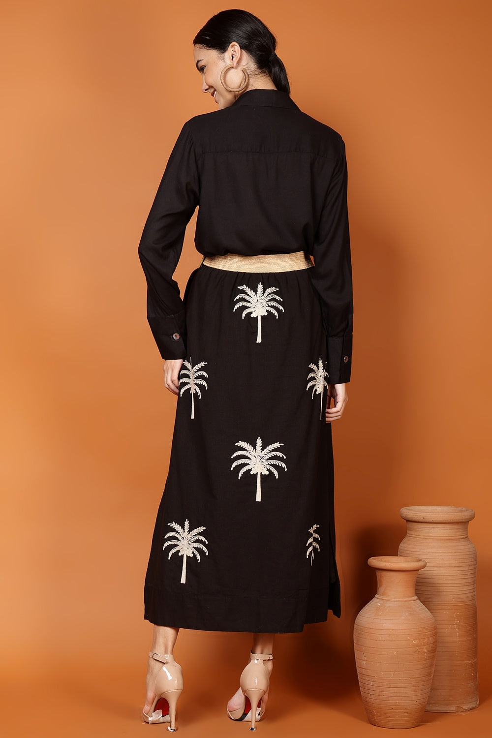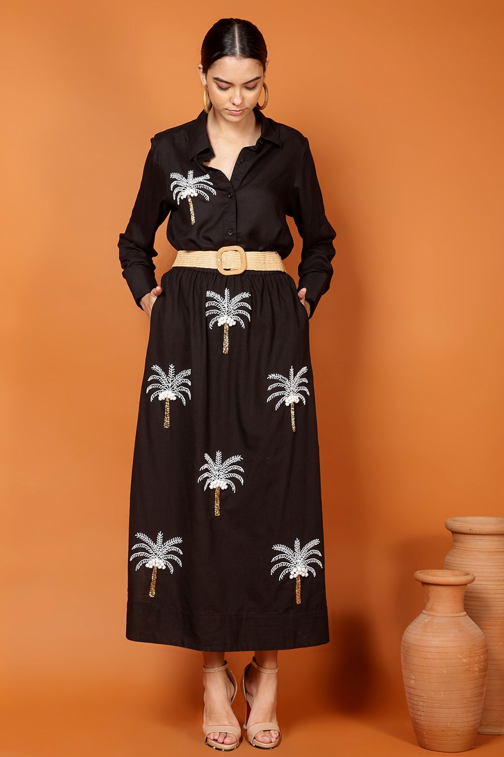 This skirt takes a classic black base and gives it a quiet tropical uprising. Delicately embroidered palm trees appear across the fabric like little reminders that life is better when you’re slightly on holiday—even if you’re just going to lunch.