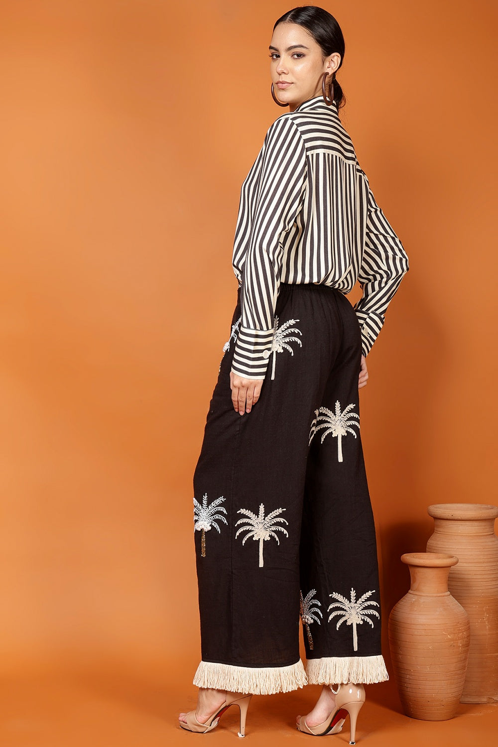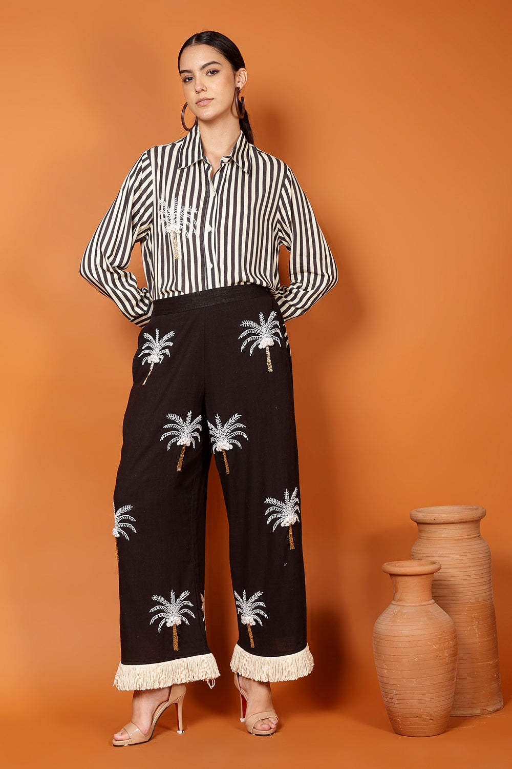 This shirt means business—but the relaxed, confident kind that leaves early and still gets promoted. With its crisp vertical stripes and tailored collar, it delivers instant polish, while the soft, floaty fabric keeps things feeling easy, breezy, and entirely under control.