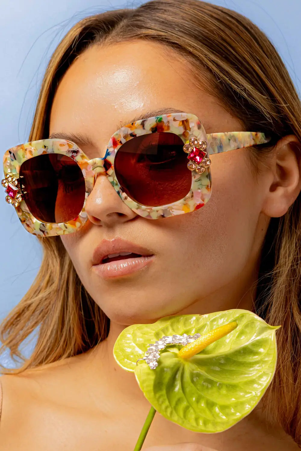 Multicoloured acetate with mint highlights swirling amongst dramatic crystal embellishments twinkling in champagne and fuchsia.