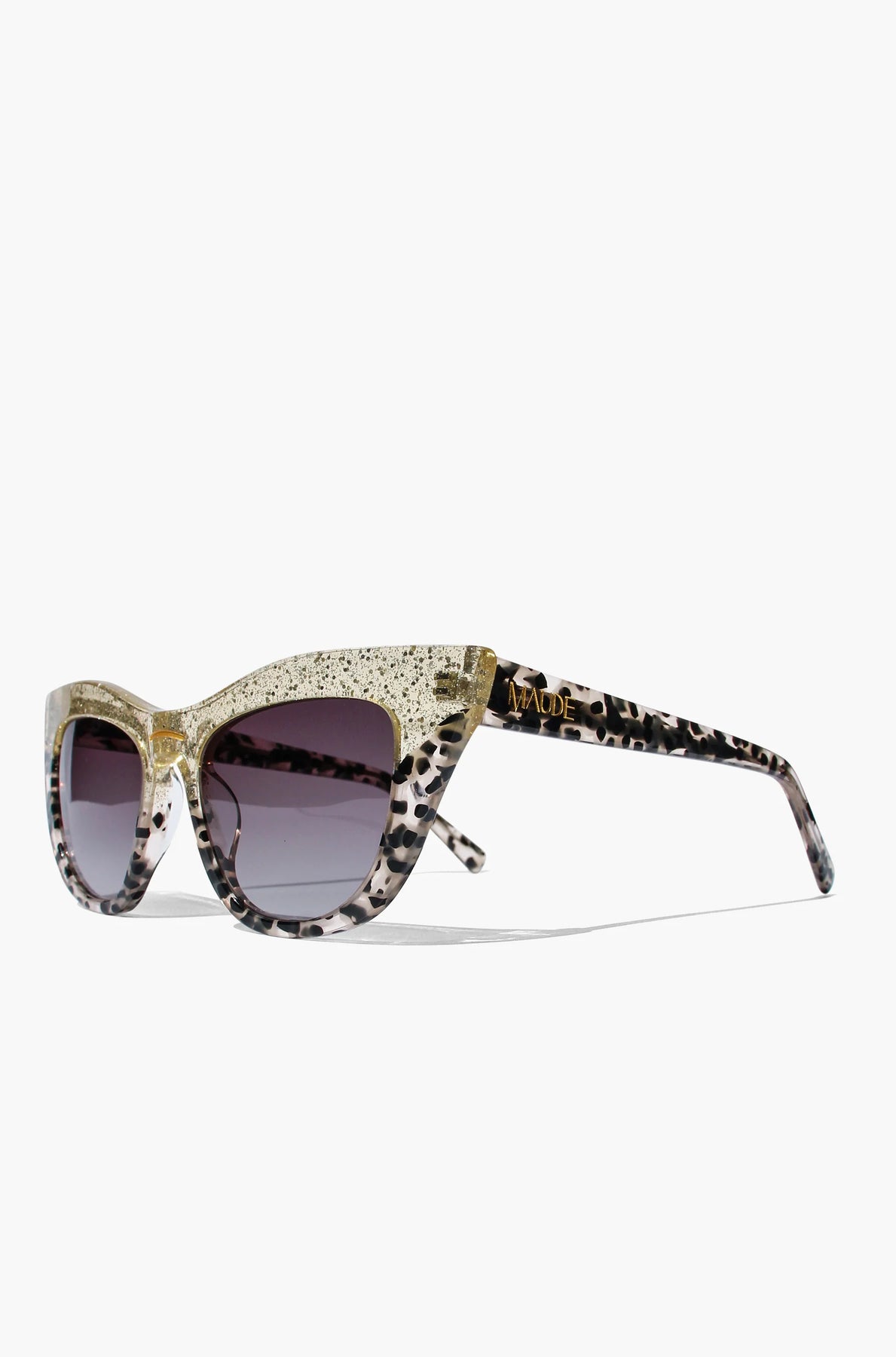 Stunning gold-glittering cat-eye frames layered over a creamy spotted acetate.