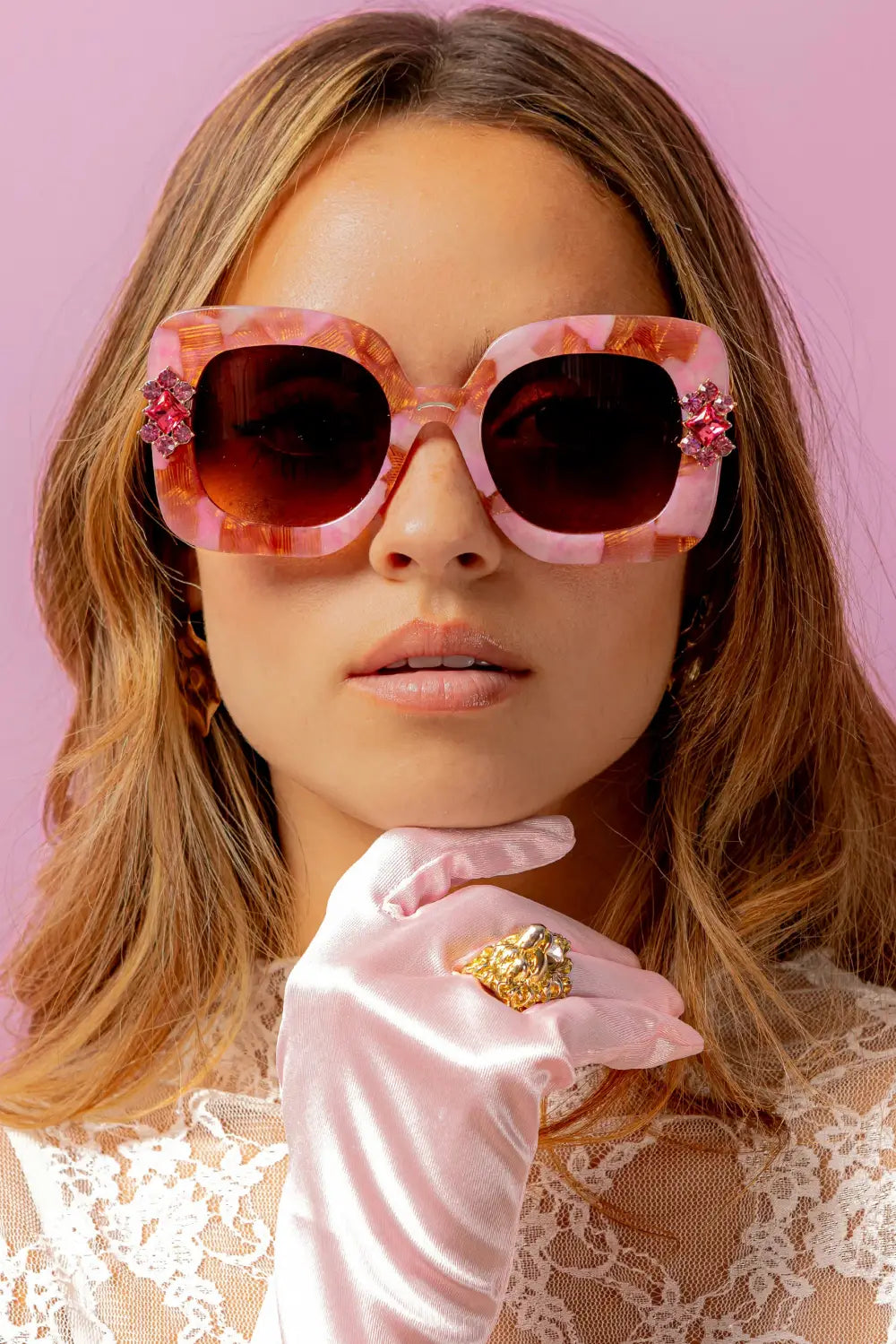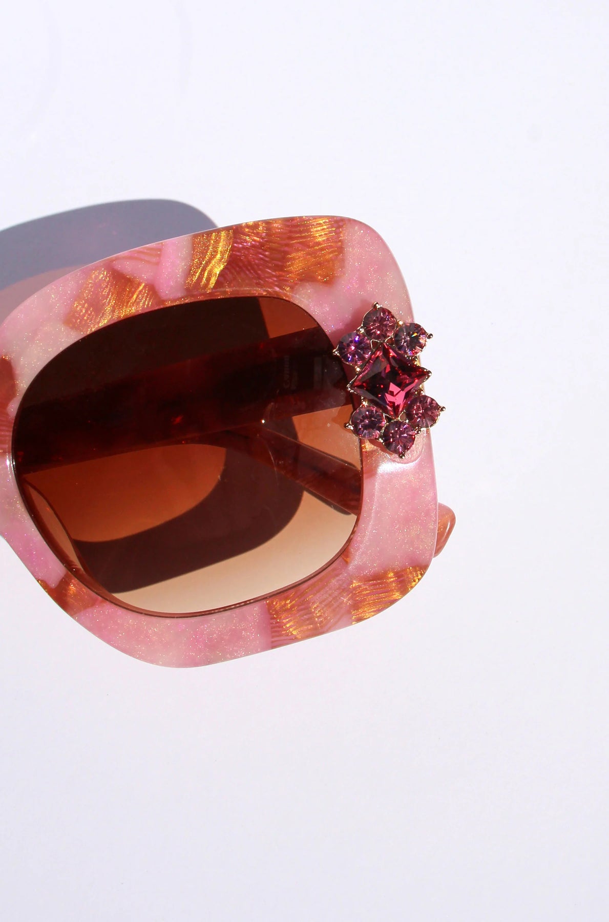 A rounded medium sized square frame in fairy-floss pink acetate, smattered with glittering gold stripes to add a depth of shimmer.