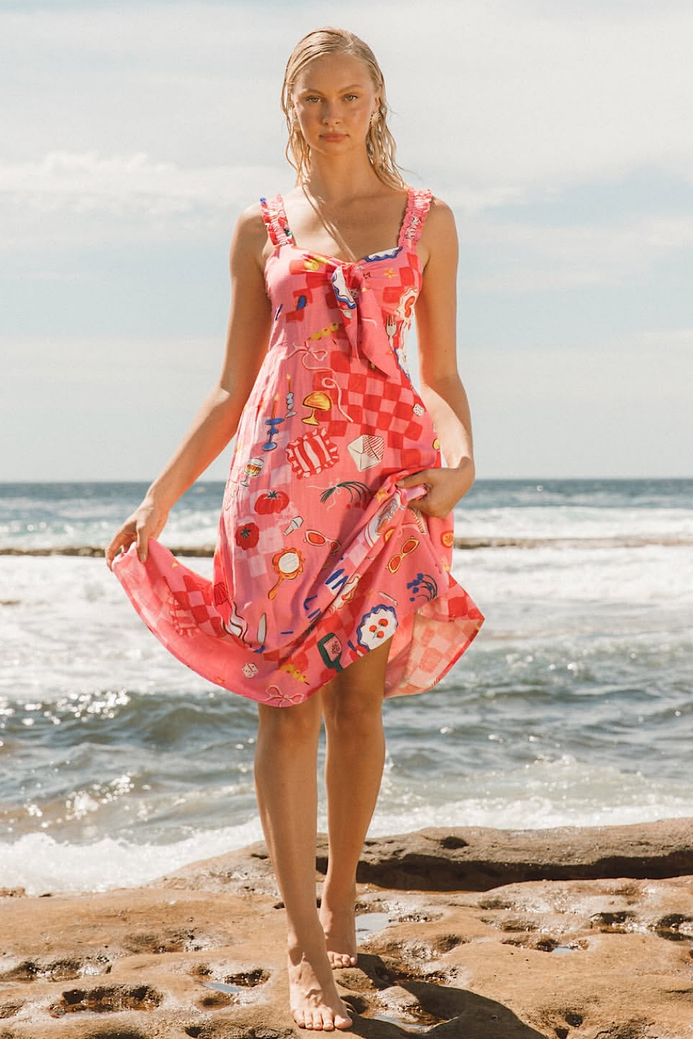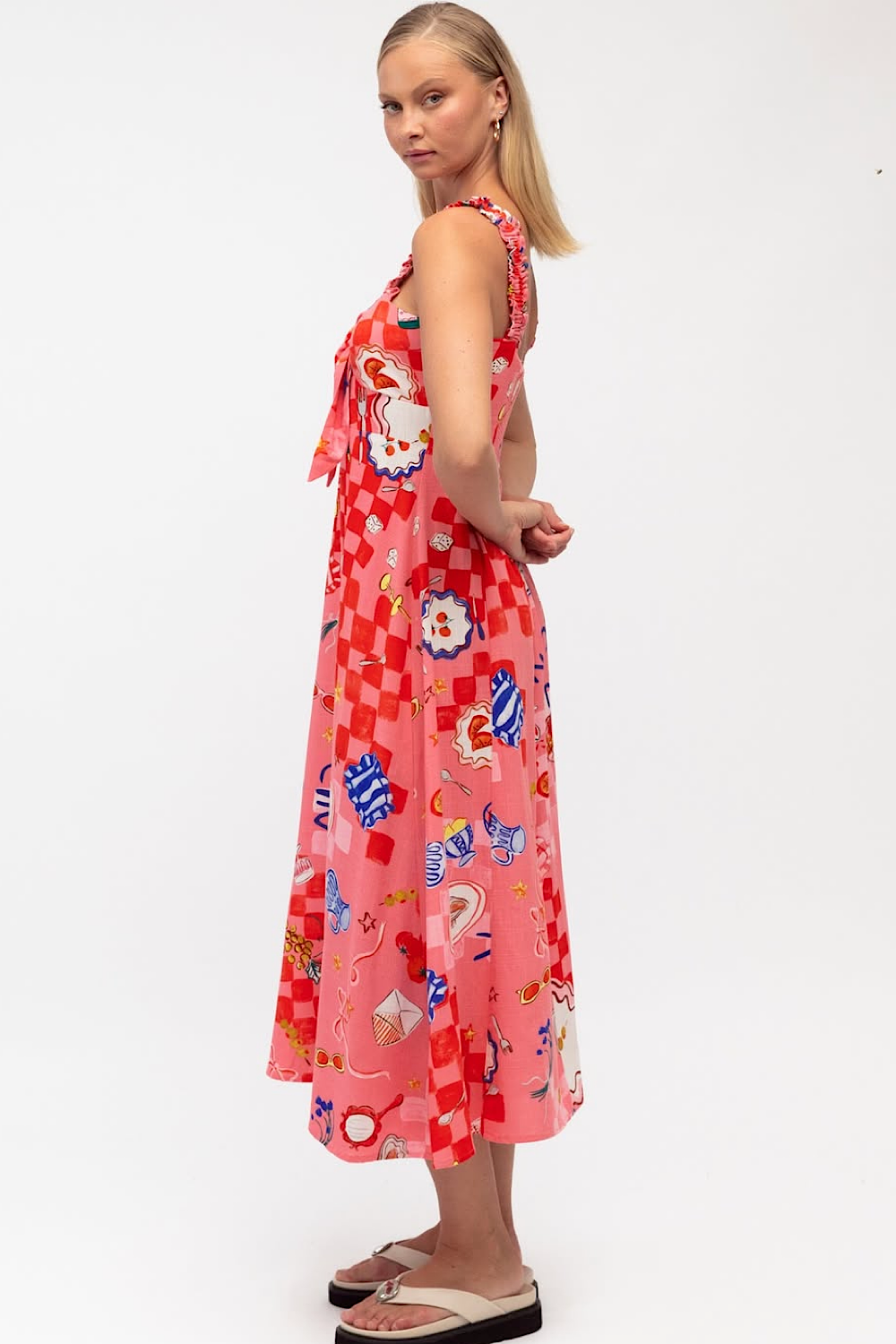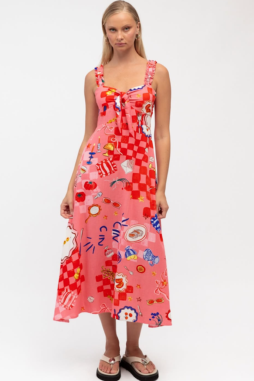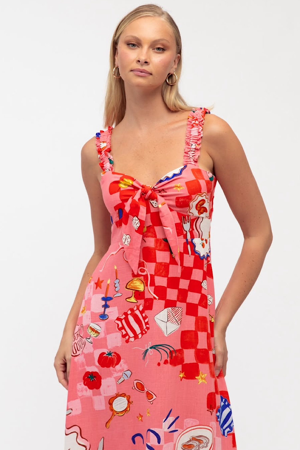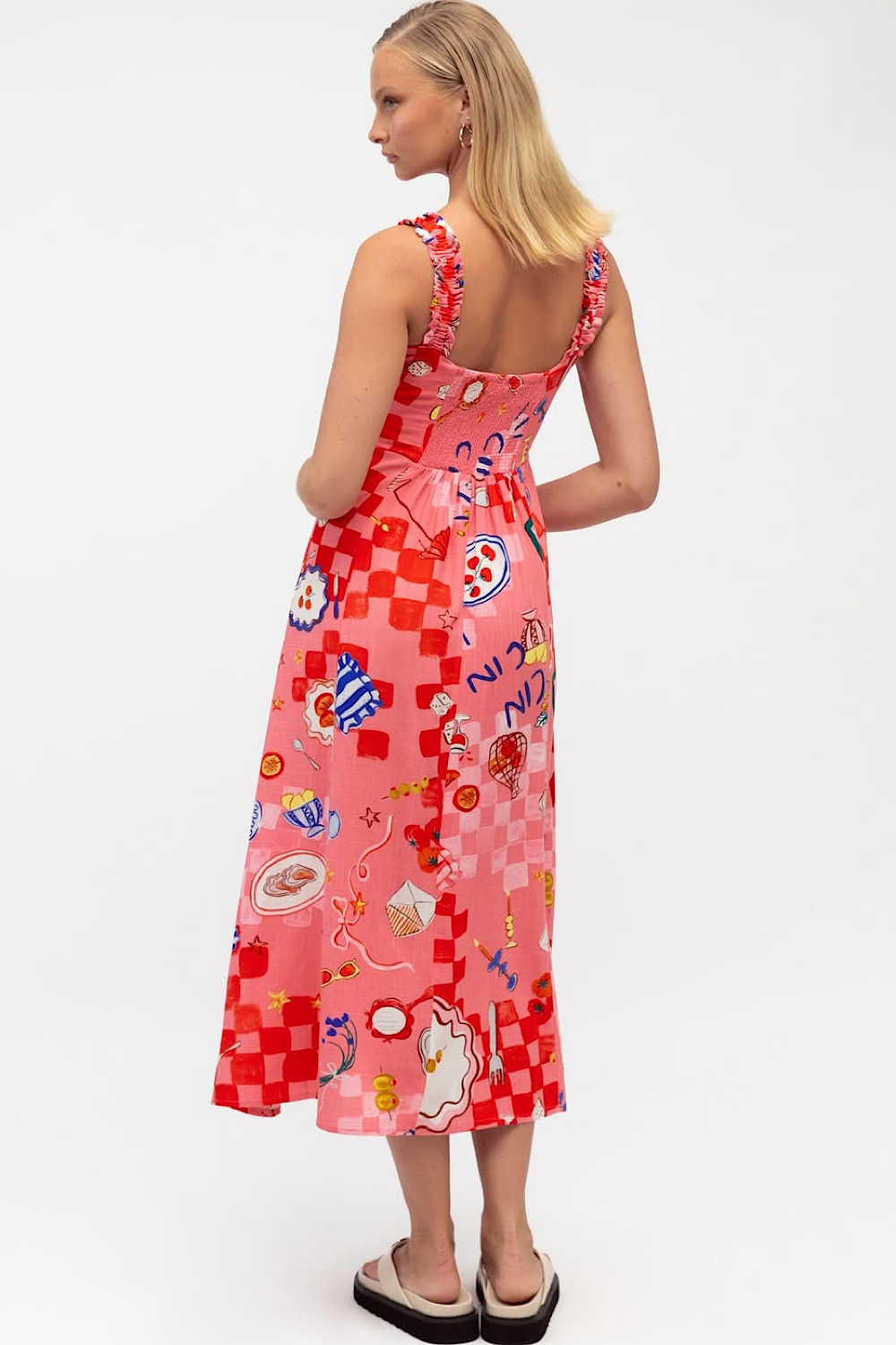 This dress is basically an Italian lunch date that turned into an all-day affair. Playful, punchy and full of personality, the Cin Cin Midi brings together cheerful checkerboard vibes and whimsical food-and-fun illustrations that feel like a toast to living loudly (and dressing accordingly).