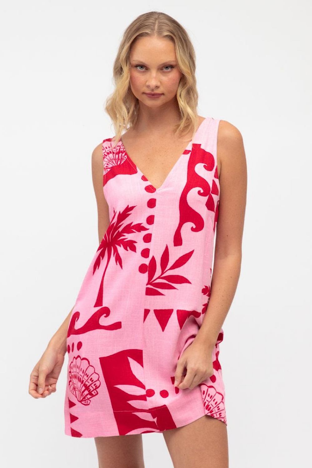 This flirty little shift is serving holiday energy, main-character confidence and “accidentally fabulous” vibes all in one easy throw-on. With its bold pink base and punchy red print, it’s basically a beach cocktail in dress form — no umbrella required.
